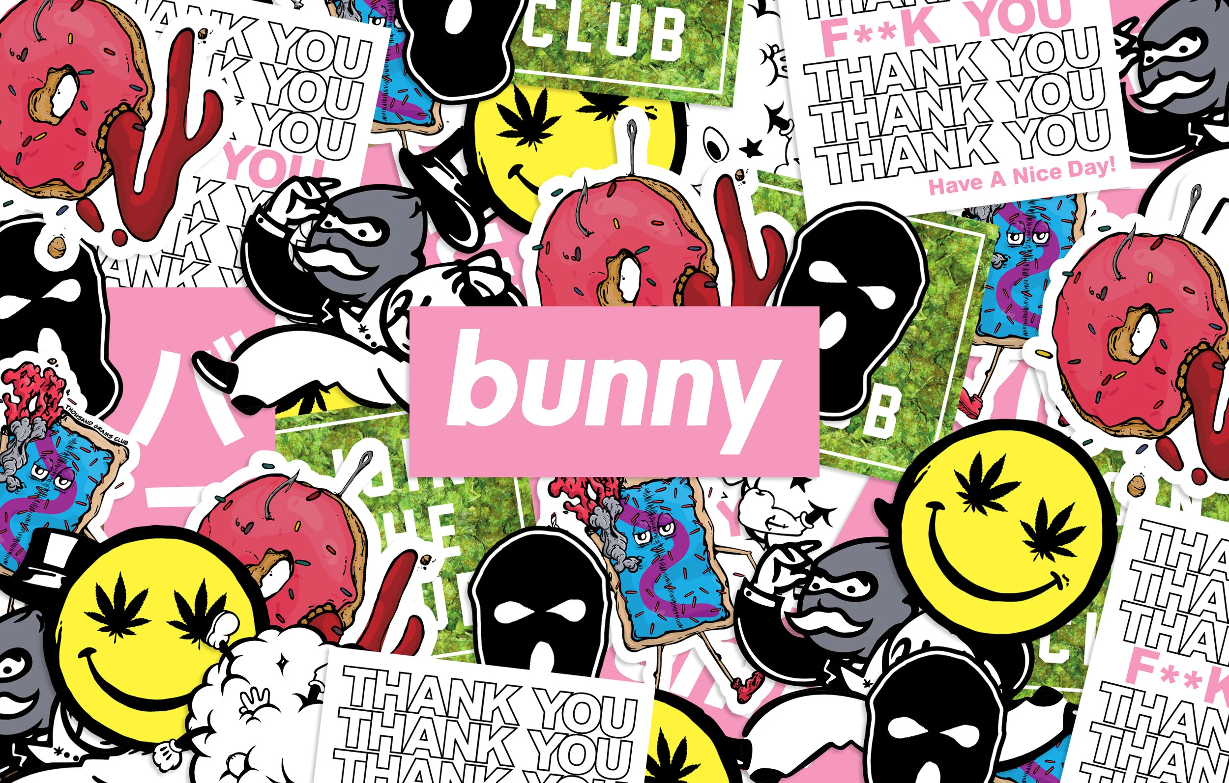 A collage of various stickers and illustrations, including pink donuts with bites taken out, yellow smiley faces with marijuana leaf eyes, black faces with white eyes, blue characters with pink tongues, a white bunny, and multiple 'thank you' messages. Some stickers have a street art or graffiti style, and there are additional graphics like grass backgrounds, smoke clouds, and a small top hat on the yellow smiley face.